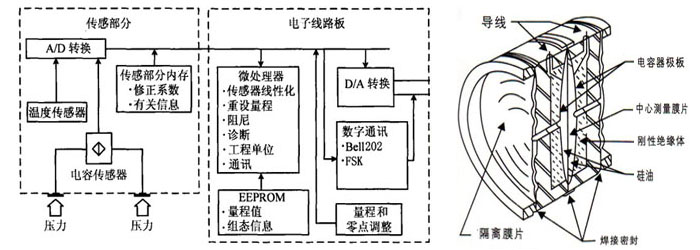 智能压力变送器由智能传感器和智能电子板两部分组成,智能传感器部分包括:电容式传感器、测量膜片检测电路、温度传感器和温度补偿电路等组成;智能电子板板部分包括:微电脑控制器及外围电路组成,完成压力信号到4~20mADC的转换。