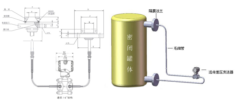 三、双法兰液位变送器尺寸图及安装示意图: