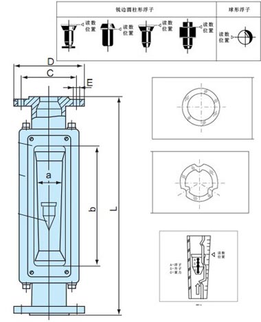 法兰、浮子、导杆、支承板及螺栓等均为不锈钢304(1Cr18Ni9Ti),型号为LZB-( )B。
