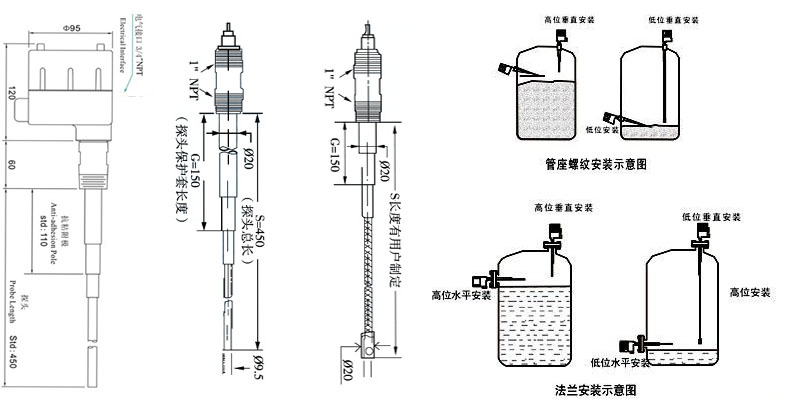 四、射频导纳物位计外形尺寸图及安装示意图: