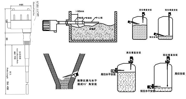 四、射频导纳物位开关外形尺寸图及安装示意图:
