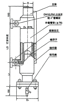 二、蒸汽伴热式磁浮子液位计尺寸图及安装示意图: