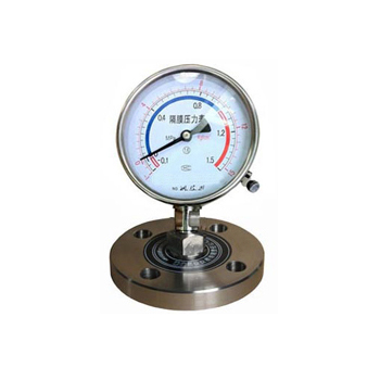 隔膜式压力表由各种通用型压力仪表和不同结构的隔膜隔离器组成一个封闭系统,内充密封液。当被测介质的压力作用于隔膜时,则隔膜产生变形,压缩封闭系统中的密封液。由于密封液的固有性质,使压力仪表中的弹性元件产生相应的弹性变形—位移,经指示装置显示压力值。当隔膜的刚度足够小时,则压力仪表指示的压力就近于被测介质的压力值。